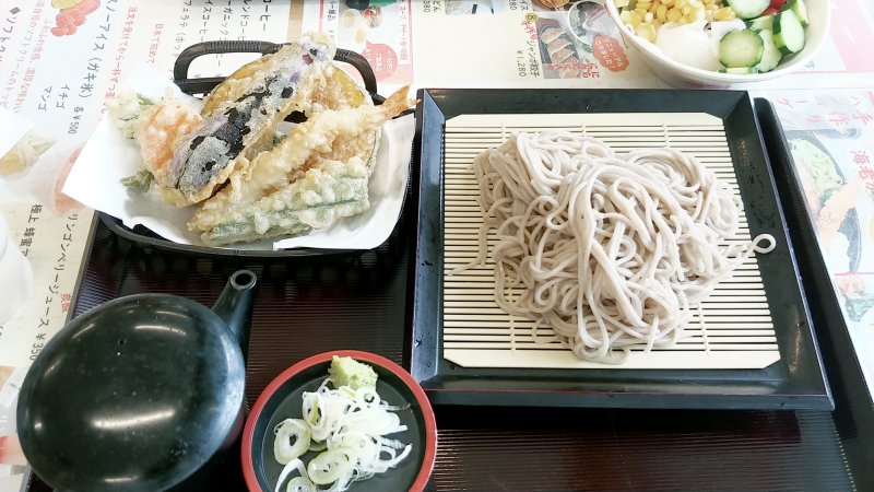 今日は藤代スポーツセンターで2時間。 土日のテニスコートはまずは空いてないのですが 16日は1週間前から雨の予報で12時から14時が空きました。 帰りの途中でランチを。 サイクリングでは何回か入っている手賀沼の野菜レストラン。 セットを注文すると野菜が食べ放題でお得。 Kさんは野菜カレーを。 私は、蕎麦と野菜天ぷら。 野菜天ぷらなのにエビが入ってやがるよ。(~_~;)