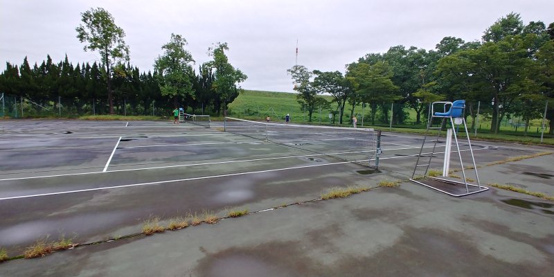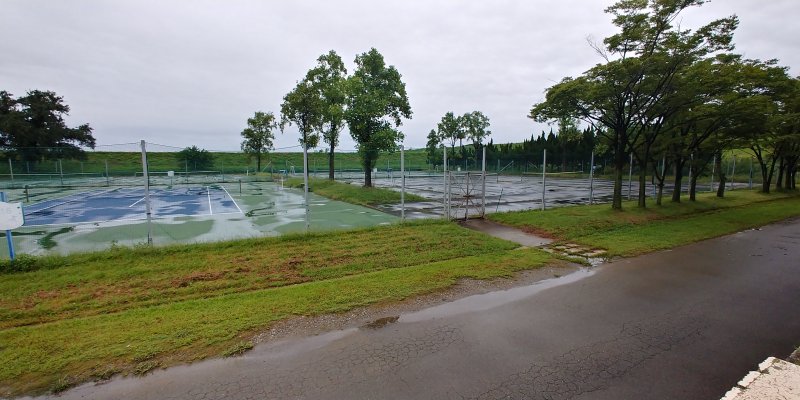 朝方まで降ったと思われる雨でコートは水溜まりが。